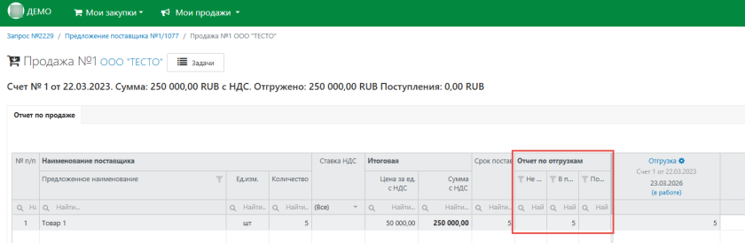 В разделе таблицы «Отчет по отгрузкам» показываются отчетные данные по основным этапам поставки (например, формирование отгрузки, отправка, получение и т.п.)