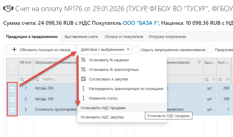 Выставьте требуемую ставку НДС для каждой позиции отдельно, указав вручную нужную ставку, либо же задайте общую для всех позиций ставку НДС, выбрав галочками вначале все требуемые позиции, далее открыв кнопку действия с выбранными и далее выберите требуемый вам вариант на все выбранные позиции установки НДС на продажу или закупку: